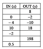 An x → y table, like the one at right, represents pairs of values of two related quantities. The input value (x) appears first, and the output value (y) appears second. For example, the x → y table at right tells us that the input value 10 is paired with the output value 18 for some rule. |